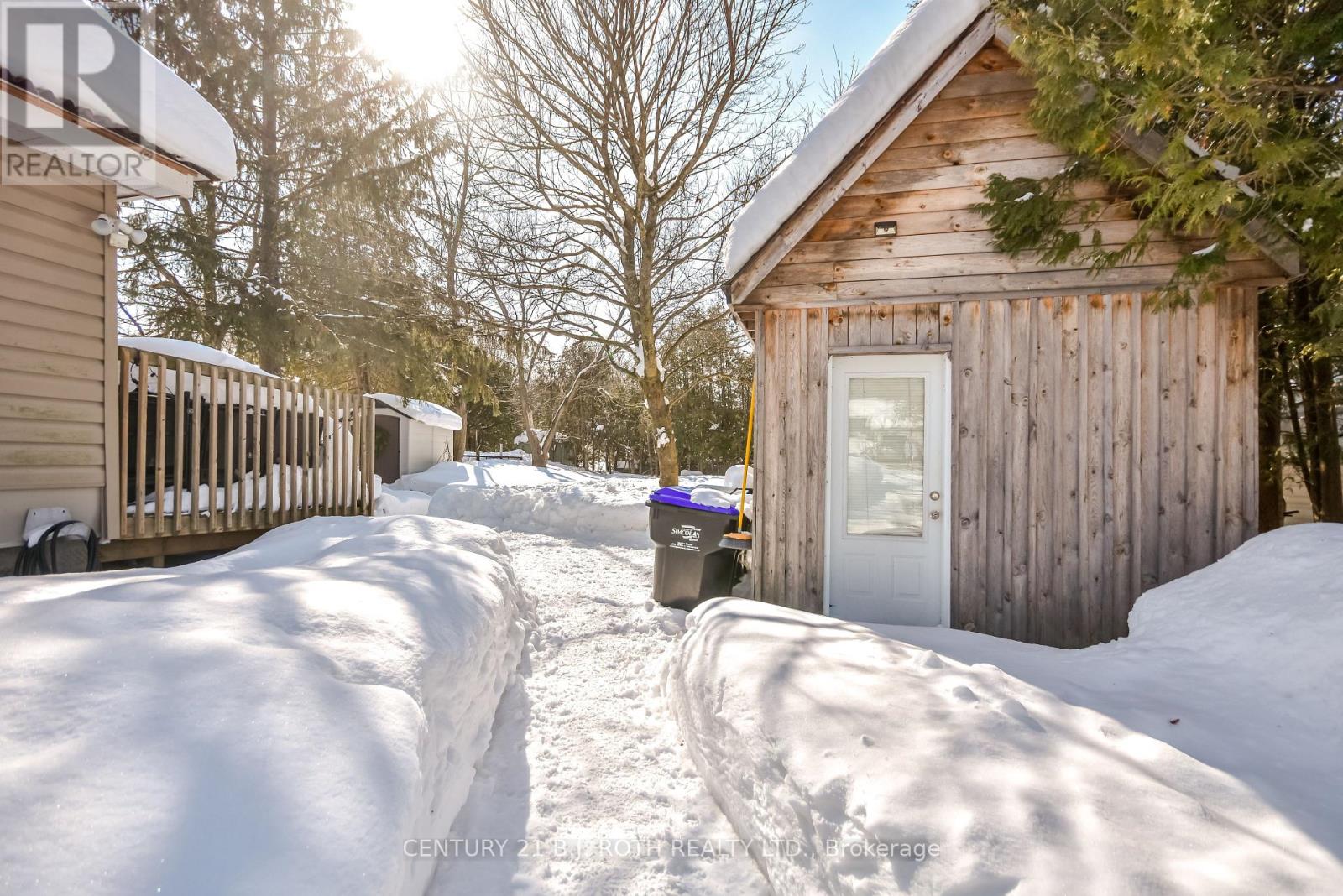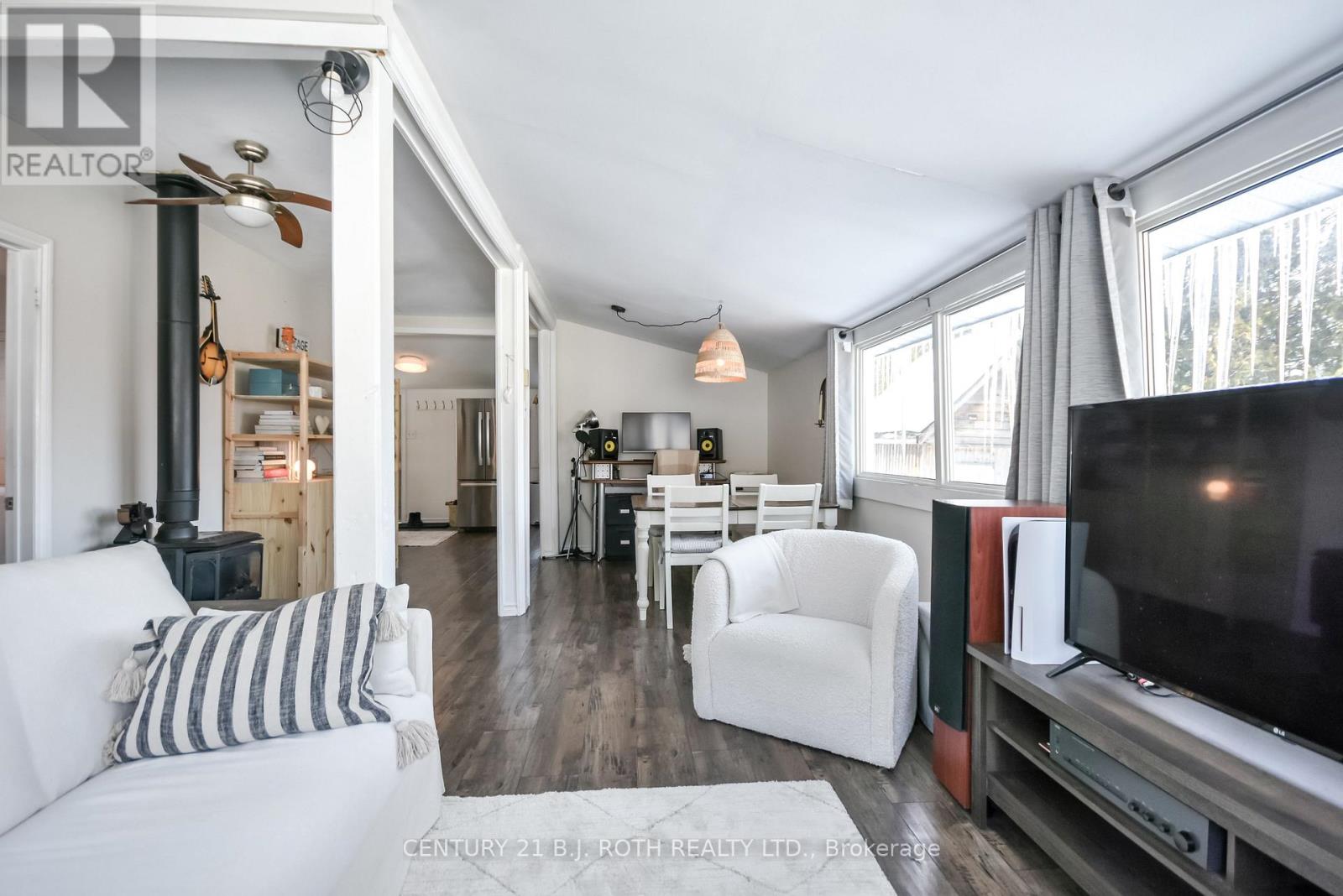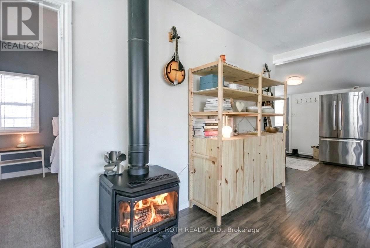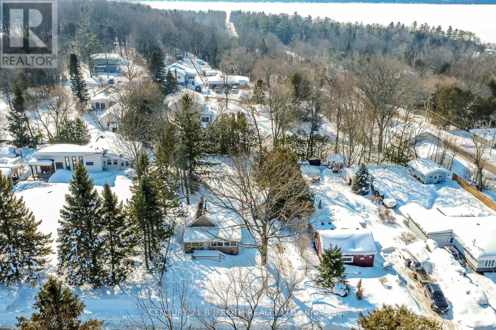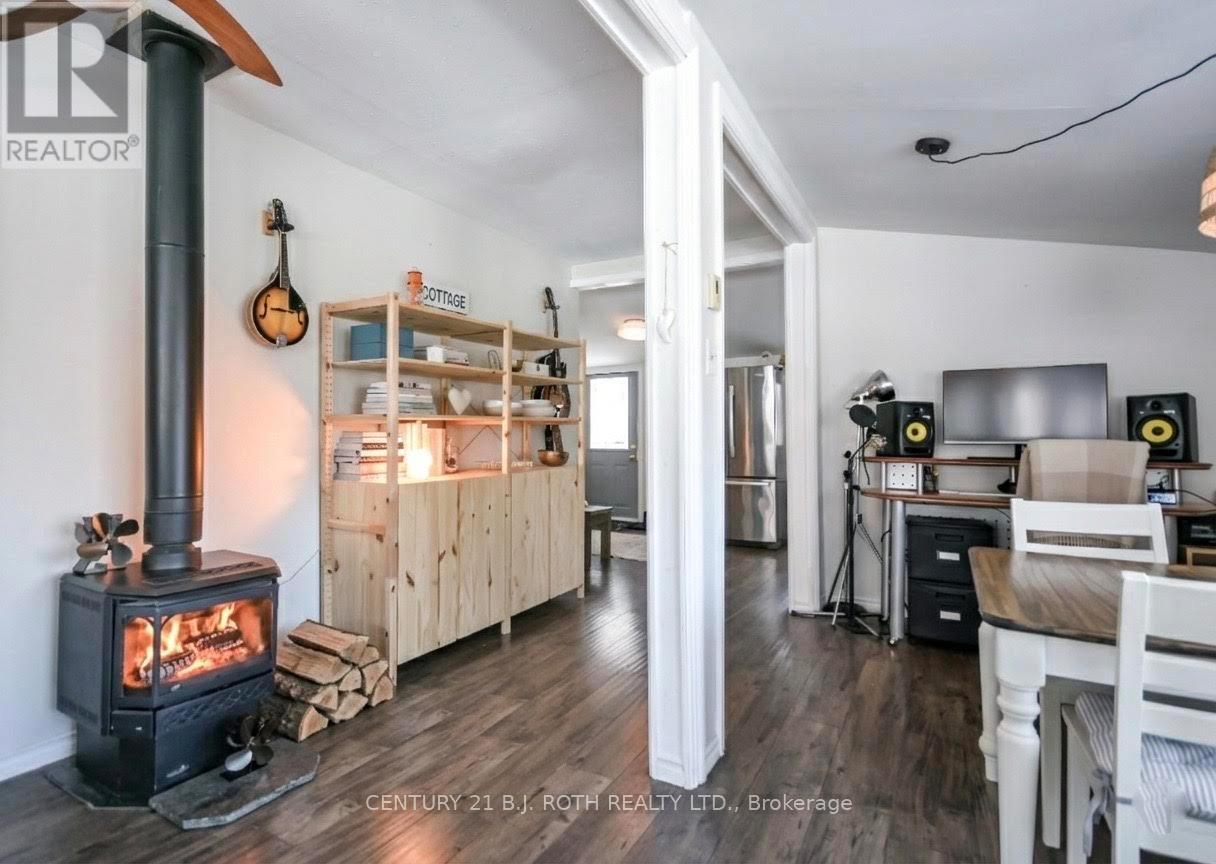 Charming, move-in ready bungalow just moments from the lake, offering an incredible opportunity to enjoy lakeside living without the waterfront price tag. This bright and inviting 2-bedroom, 1-bath home features approximately over 700 square feet of thoughtfully designed space with an open-concept living and dining area filled with natural light. Large windows create an airy feel, while the Napoleon gas fireplace (recently serviced) adds warmth and cozy character - perfect for year-round comfort. The sun-filled front living area offers flexible space for relaxing or entertaining, and the neutral finishes throughout make the home feel fresh and welcoming. Set on a mature, treed lot in an established neighborhood, the property also includes a detached outbuilding ideal for storage, workshop or hobbies. Conveniently located just minutes from Highway 400 and within easy reach of Midland and Orillia, and Muskoka, this home offers an ideal balance of peaceful surroundings and commuter-friendly access. Just a short distance to the lake, you can enjoy nearby beaches/swimming, stunning waterfront trails (walking/biking), boating, shopping and year-round recreation while still benefiting from privacy and affordability. The driveway easily accommodates 4 cars. Whether you're a first-time buyer, downsizer, or looking for a weekend escape, this property delivers charm, location, and lifestyle at an accessible price point. (id:64384)