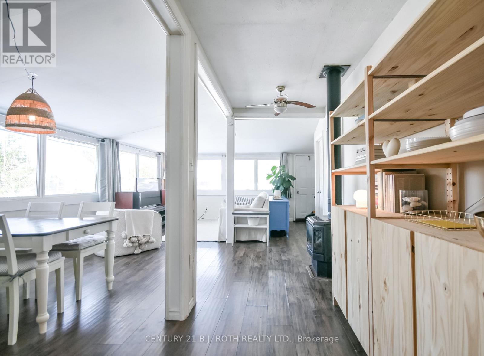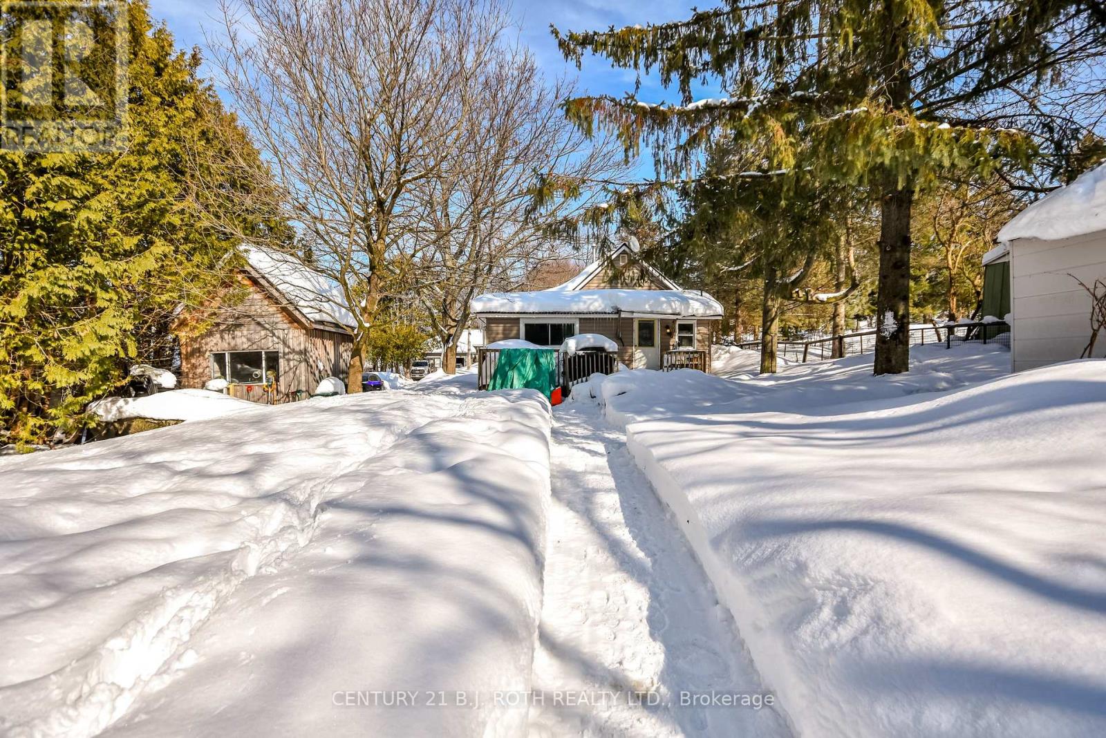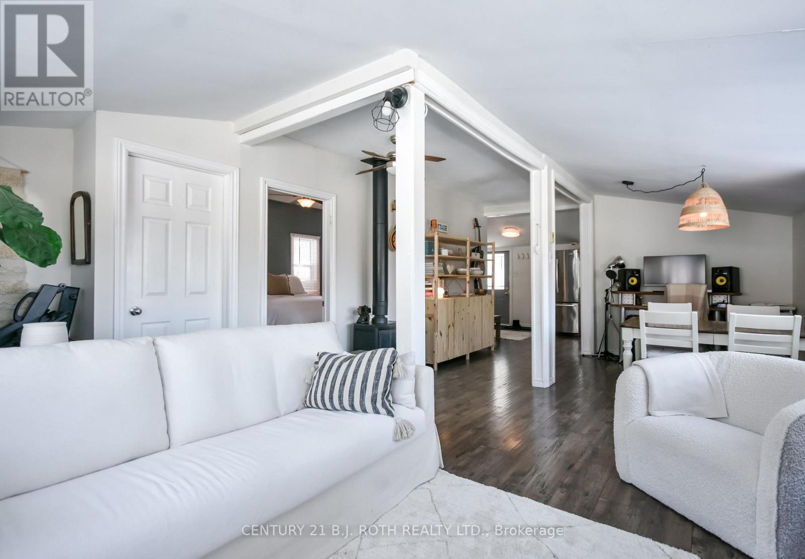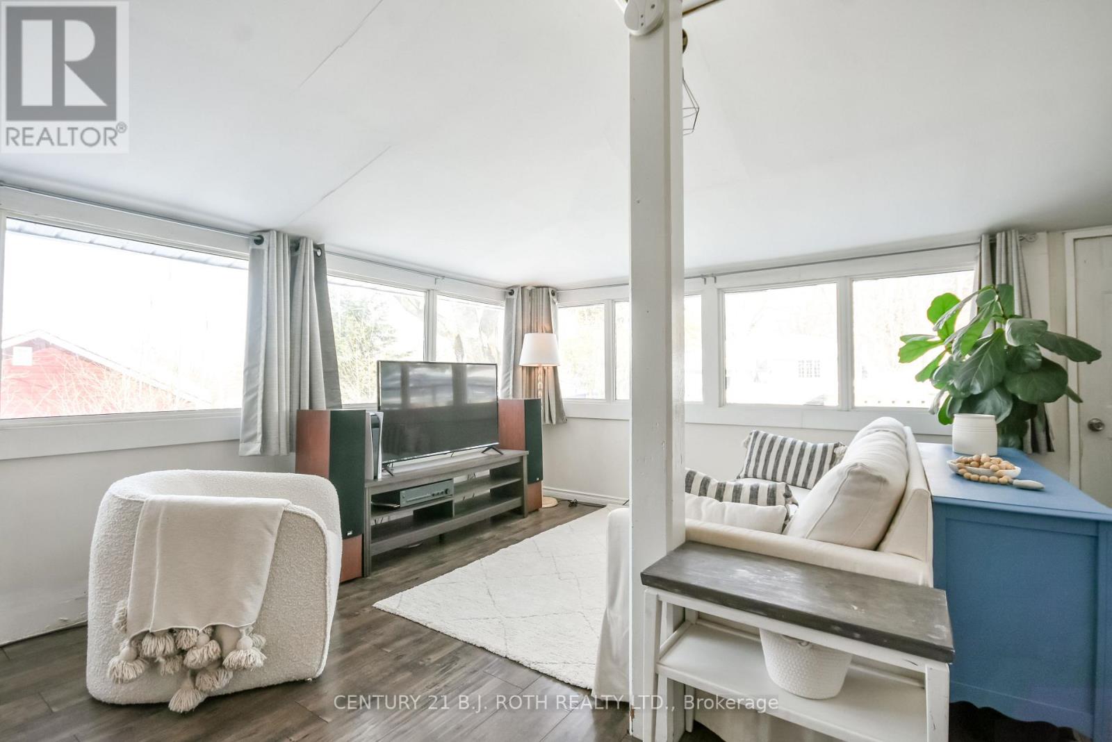 Charming, move-in ready bungalow just moments from the lake, offering an incredible opportunity to enjoy lakeside living without the waterfront price tag. This bright and inviting 2-bedroom, 1-bath home features approximately over 700 square feet of thoughtfully designed space with an open-concept living and dining area filled with natural light. Large windows create an airy feel, while the Napoleon gas fireplace (recently serviced) adds warmth and cozy character - perfect for year-round comfort. The sun-filled front living area offers flexible space for relaxing or entertaining, and the neutral finishes throughout make the home feel fresh and welcoming. Set on a mature, treed lot in an established neighborhood, the property also includes a detached outbuilding ideal for storage, workshop or hobbies. Conveniently located just minutes from Highway 400 and within easy reach of Midland and Orillia, and Muskoka, this home offers an ideal balance of peaceful surroundings and commuter-friendly access. Just a short distance to the lake, you can enjoy nearby beaches/swimming, stunning waterfront trails (walking/biking), boating, shopping and year-round recreation while still benefiting from privacy and affordability. The driveway easily accommodates 4 cars. Whether you're a first-time buyer, downsizer, or looking for a weekend escape, this property delivers charm, location, and lifestyle at an accessible price point. (id:64384)