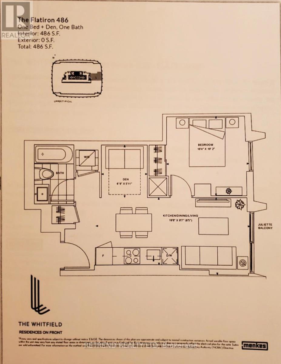 Welcome to The Whitfield by Menkes, a brand-new luxury residence offering a bright and thoughtfully designed suite. This 1 Bedroom + Den unit (486 sq ft) features a versatile den that can easily function as a second bedroom or a private home office. Enjoy an east-facing exposure with floor-to-ceiling windows, filling the space with abundant natural light throughout the day. The open-concept living and dining area is complemented by a sleek, modern kitchen complete with backsplash and built-in appliances. The cozy bedroom offers a comfortable retreat with ample closet space. Ideally located just steps from No Frills, Banks, George Brown College, St. Lawrence Market, and the vibrant Distillery District. Enjoy convenient access to public transit, dining, shopping, and more. Residents benefit from premium amenities including a 24-hour concierge services. (id:64384)