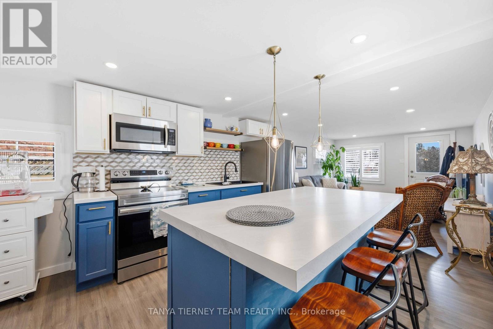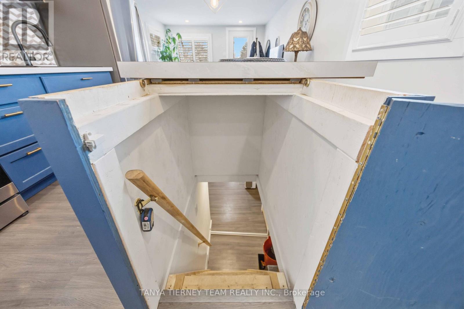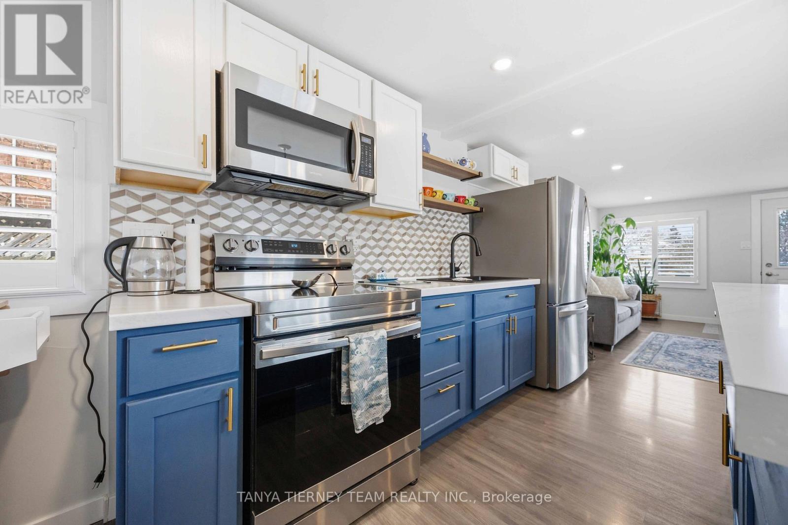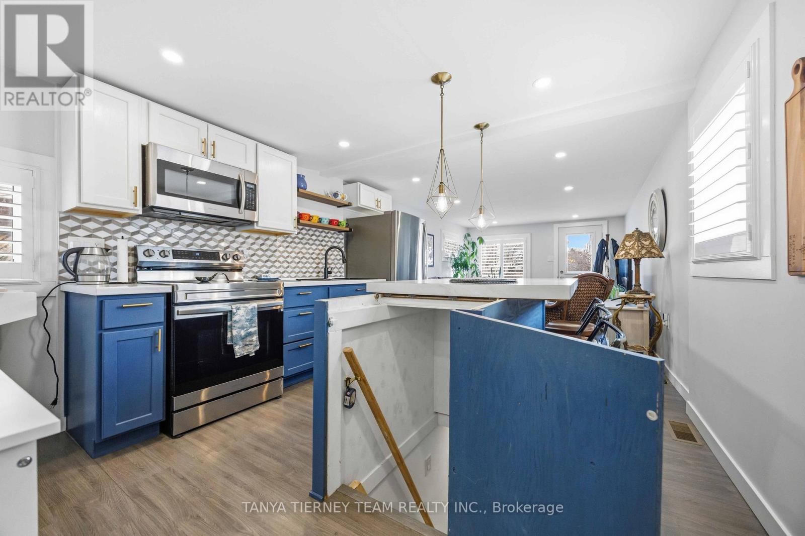 Cute and cozy bungalow situated on a oversized deep lot, perfect for first time buyers or those looking to downsize, to the picture perfect community of Cobourg. Close to the vibrant downtown with ample shops and dining options, and just minutes to amazing Cobourg beach! Inside you'll find a recently renovated home, with many updates. Featuring a stunning open concept living area, with bright pot lights, updated flooring and california shutters throughout (2022). The gourmet eat in kitchen boasts newer counters, modern stainless appliances with new stove (2024), ceramic backsplash and beautiful cabinetry with accent hardware throughout. Don't miss the secret staircase with hidden access under the large centre island and leading to additional living space below, perfect for a rec room, kids play zone, hobby room or man cave! The thoughtful layout continues with a lovely 3 piece bath and laundry combo (washer/dryer 2025) with barrier free shower and two well appointed bedrooms, including a walkout to the large deck and deep yard with newer garden shed (2023). Additional updates include the furnace in '21, central air '22, owned HWT '21, front deck '25, sump pump '24 and freshly painted throughout in '25. (id:64384)